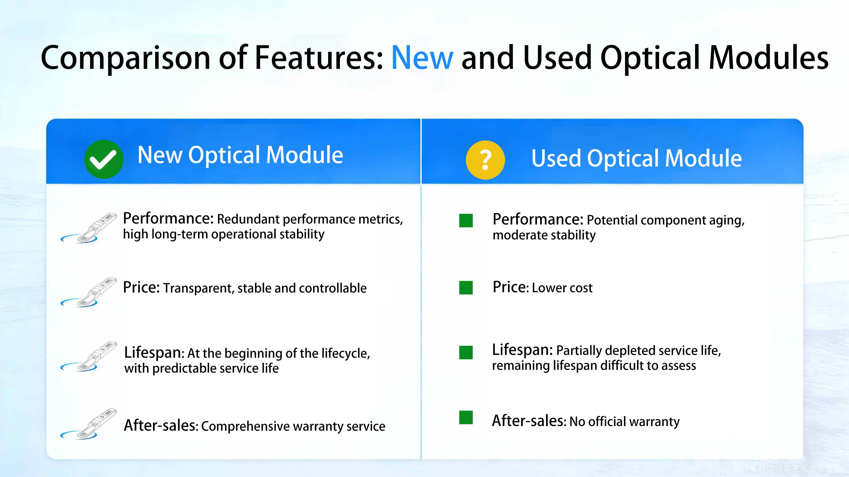 Second-Hand vs. Brand-New Optical Module Comprehensive Comparison of Performance, Assurance, and Stability